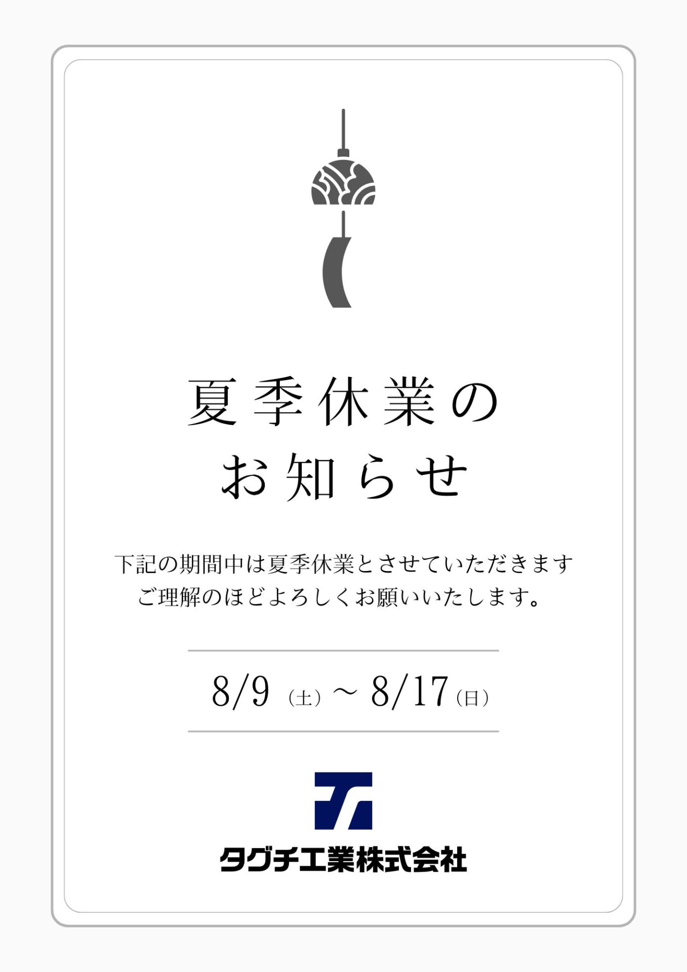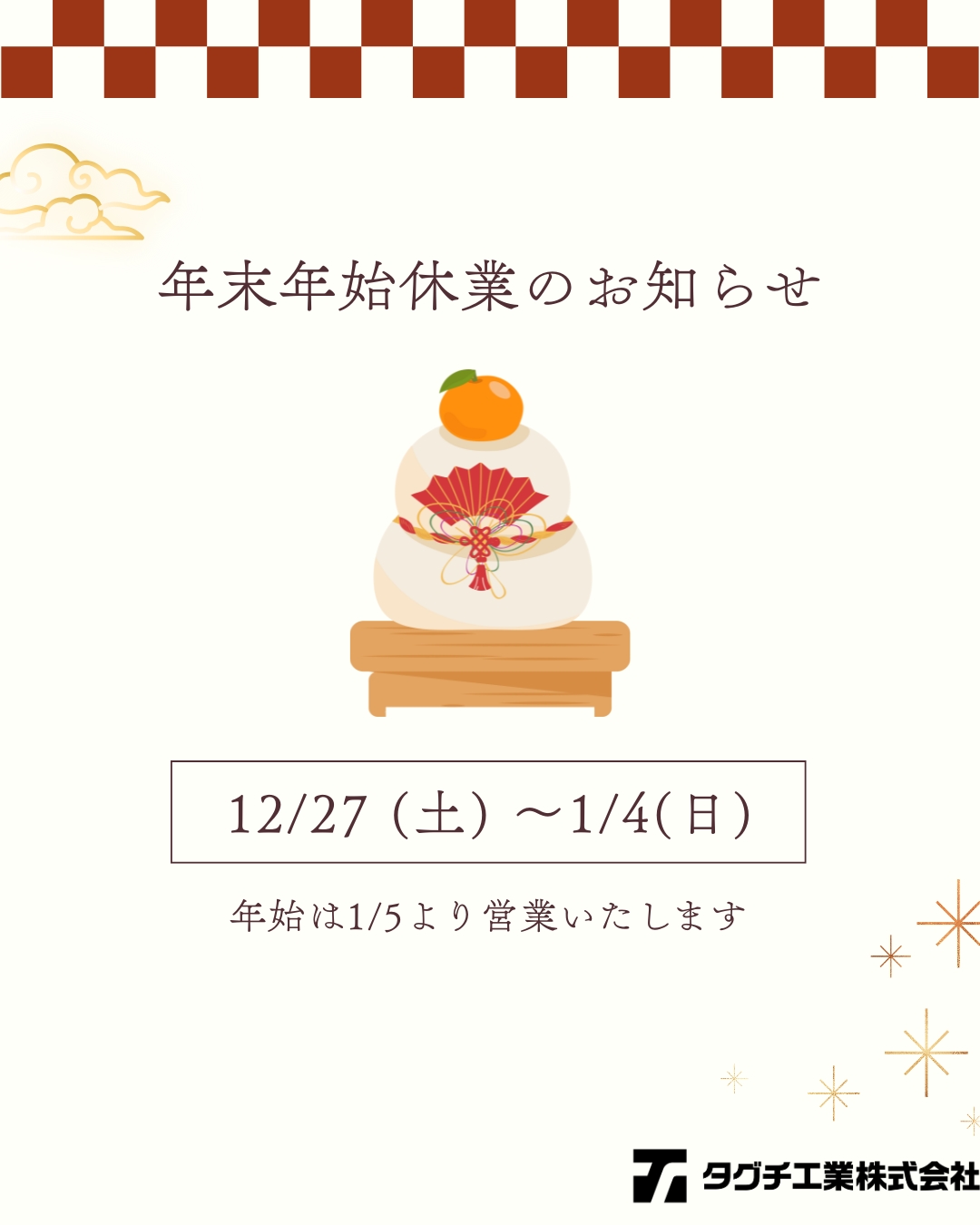 タグチ工業株式会社は、下記の期間を年末年始休暇とさせていただきます。